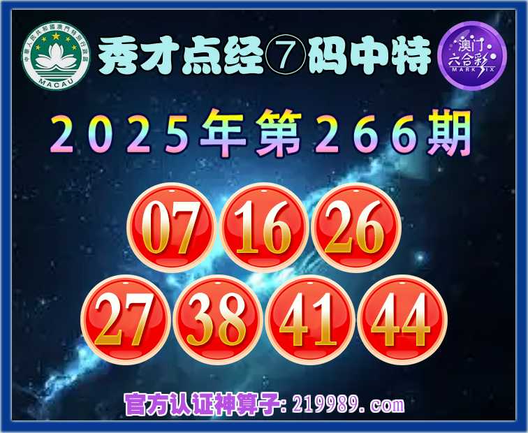 266期:【秀才点经】 🧧⑦码中特🧧【07.16.26.27.38.41.44】开:41