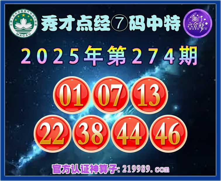 274期:【秀才点经】 🧧⑦码中特🧧【01.07.13.22.38.44.46】开:44